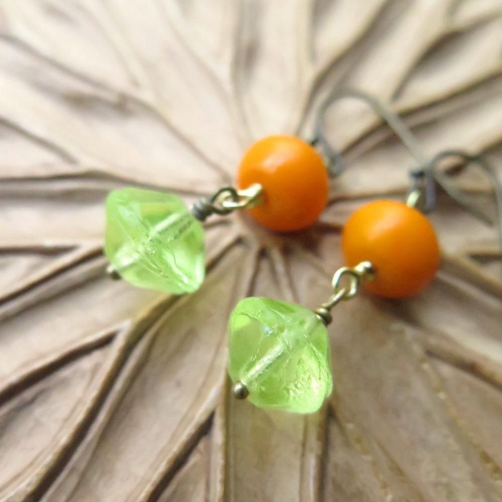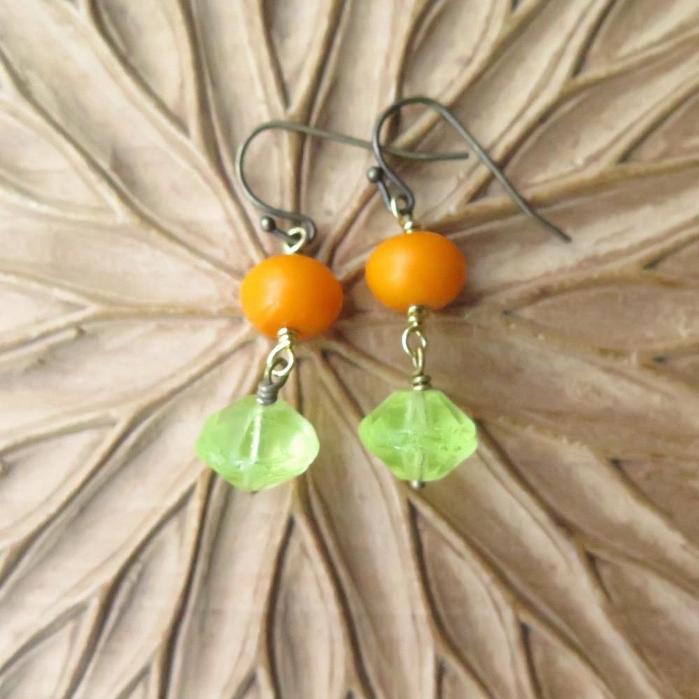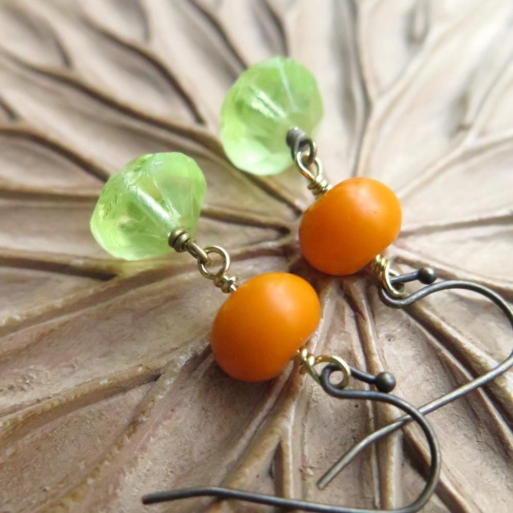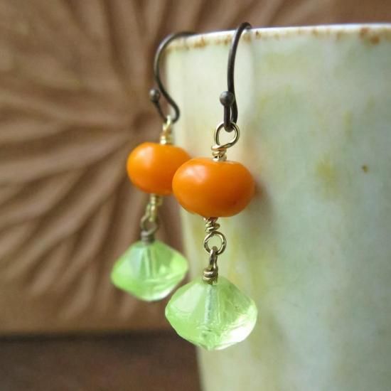 瑞々しいレモンイエローのウランガラスと、蜜柑のようなオレンジ色のボヘミア玉のピアス&イヤリングです。
