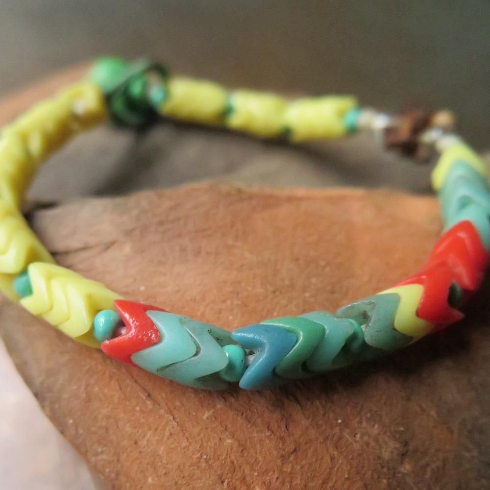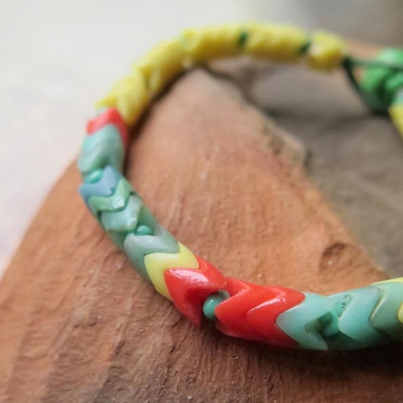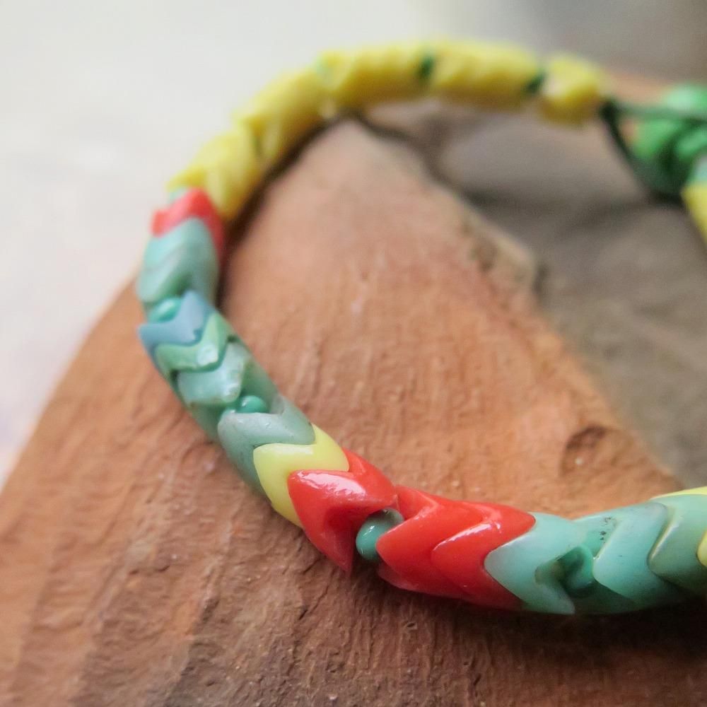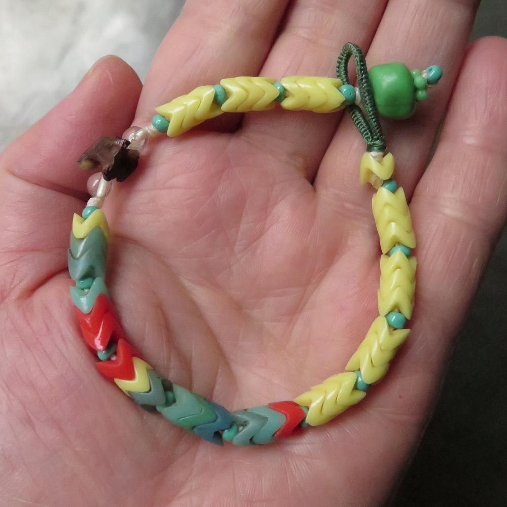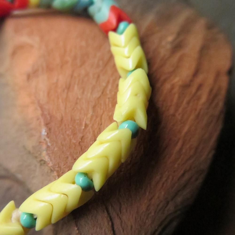淡い黄色のスネークビーズに、緑や赤のスネークビーズをミックス。