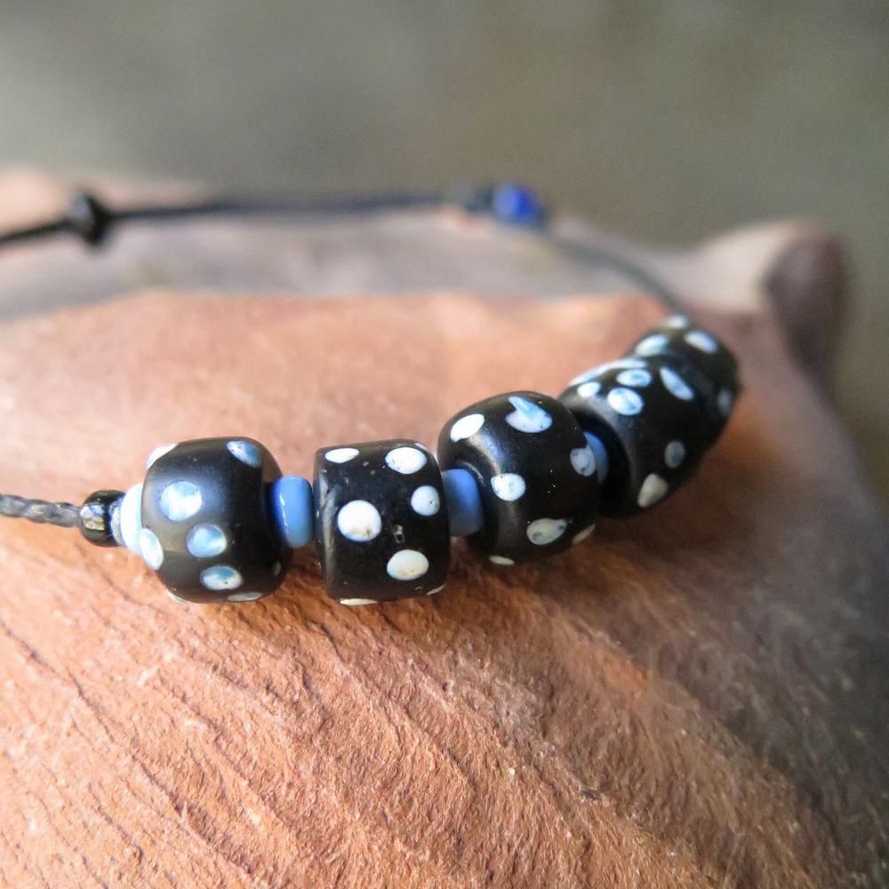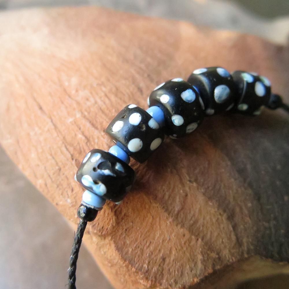 2本の紐をまとめるのは、黒のヴェネチアンシードビーズ。