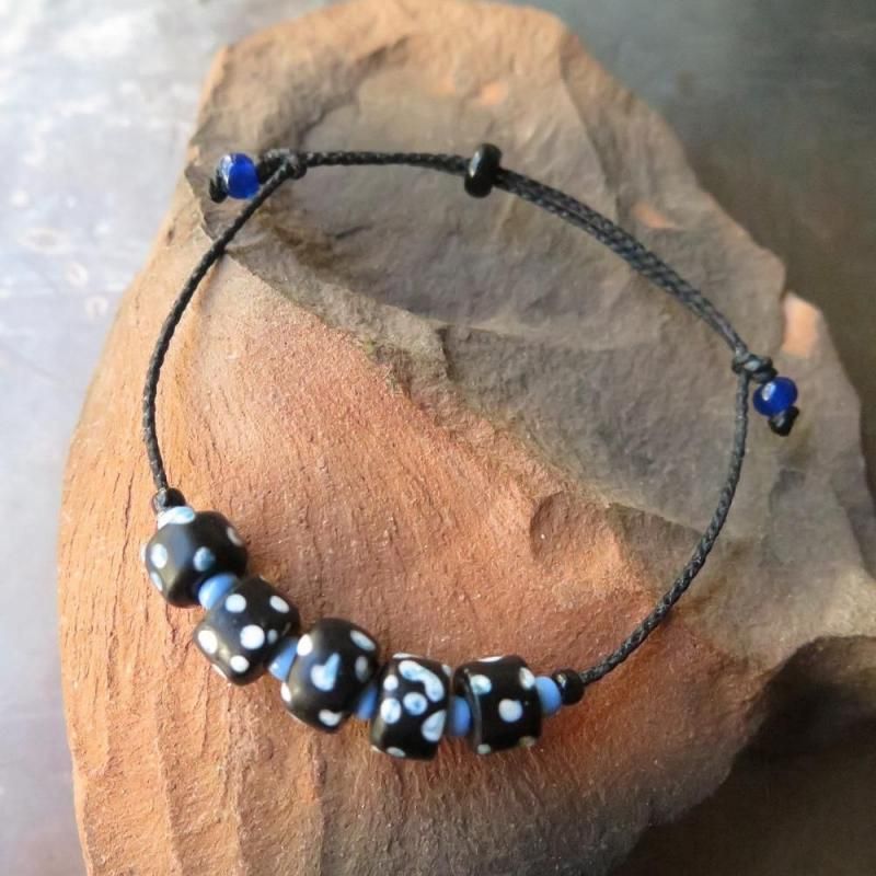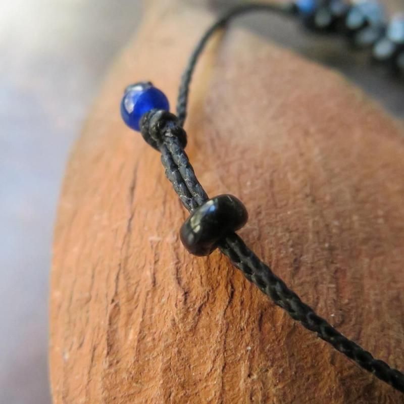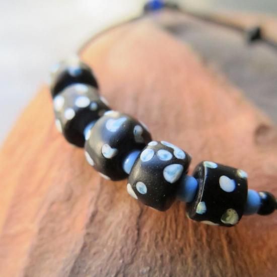 2本の紐をまとめるのは、黒のヴェネチアンシードビーズ。